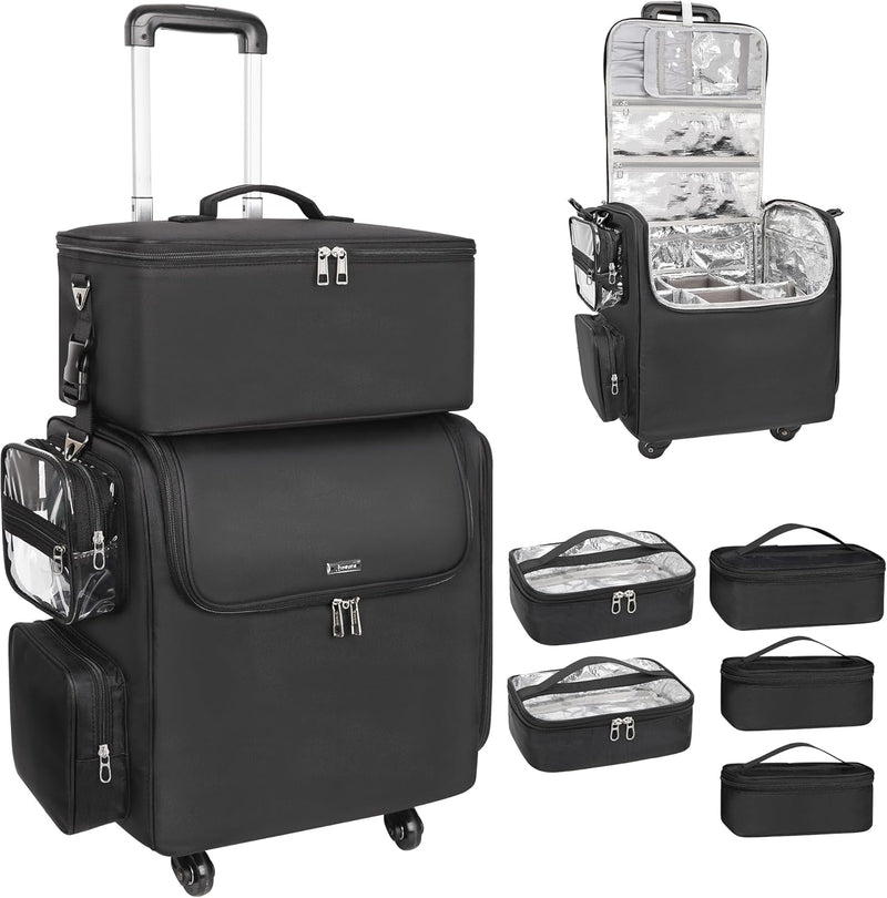 Large Rolling Makeup Case,Professional Makeup Artist Bag with 4 Small Bag Makeup Case, Adjustable Dividers, Portable Travel Supply Station for Cosmetics Storage Organizer Trolley Suitcase Makeup Cart Professional Trolley Cosmetic...